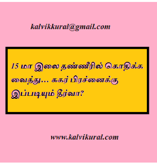 தண்ணீரில் நன்கு கொதிக்க வைக்கவும். இலைகளை நன்கு கொதித்த பிறகு, ஒரு இரவு விட்டுவிட்டு அடுத்தநாள் காலையில். தண்ணீரை வடிகட்டி வெறும் வயிற்றில் குடிக்கவும். இந்த கலவையை தினமும் காலையில் தொடர்ந்து சில மாதங்களுக்கு குடிப்பதால் உங்கள் இரத்தத்தில் உள்ள சர்க்கரை அளவுகளில் மாற்றம் ஏற்படுவதை உணரலாம்.