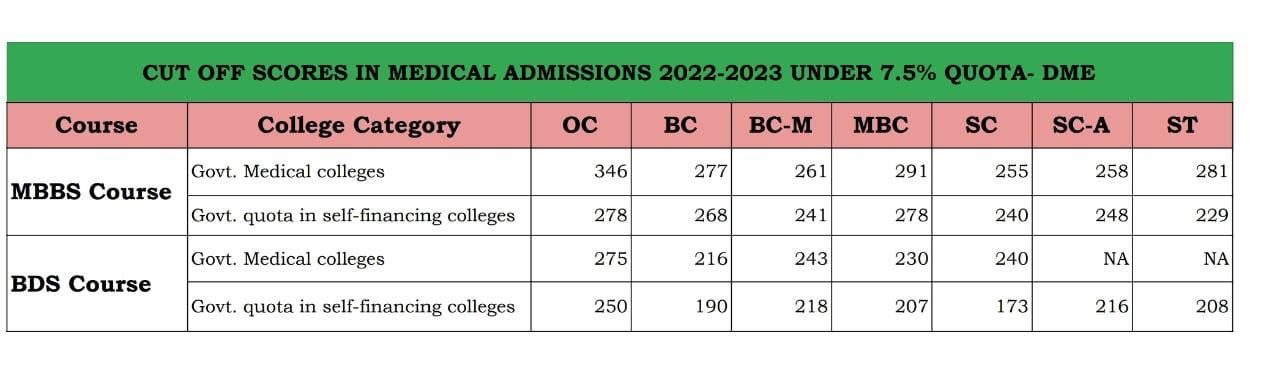 2022-23 MBBS & BDS CUT-OFF - UNDER 7.5% RESERVATION