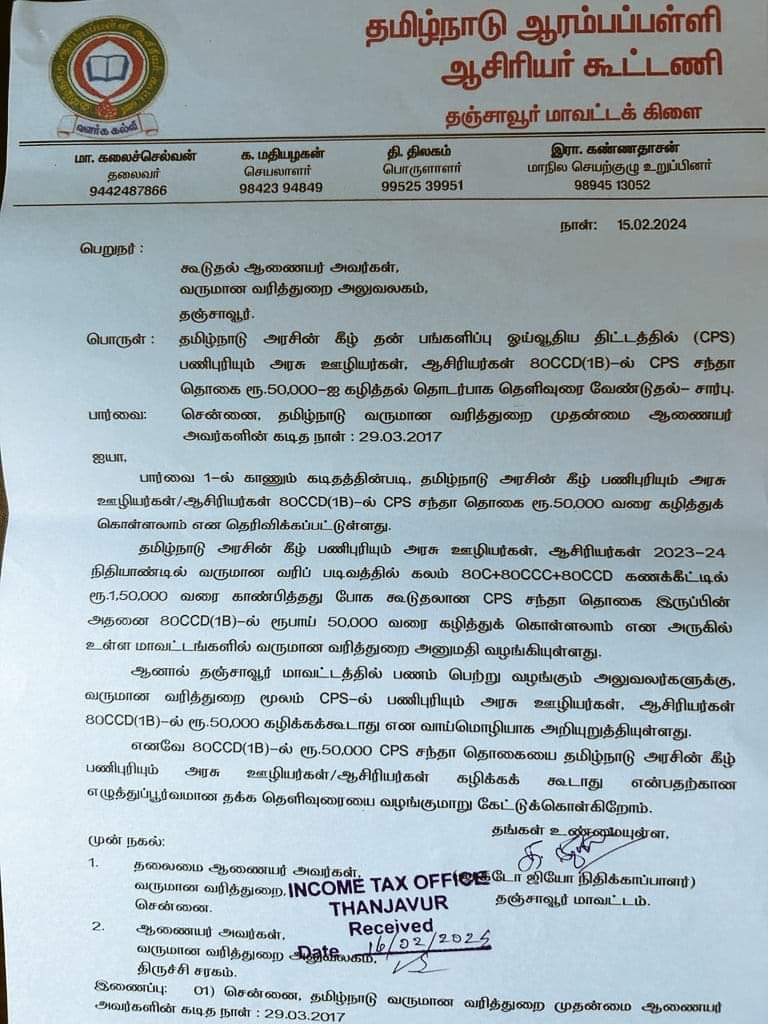 தமிழக அரசு ஊழியர்கள் 80CCDல் (1,50,000 வரை சேமிப்பு) CPS தொகையை கழிக்க அனுமதிக்கும் வருமான வரித்துறை,