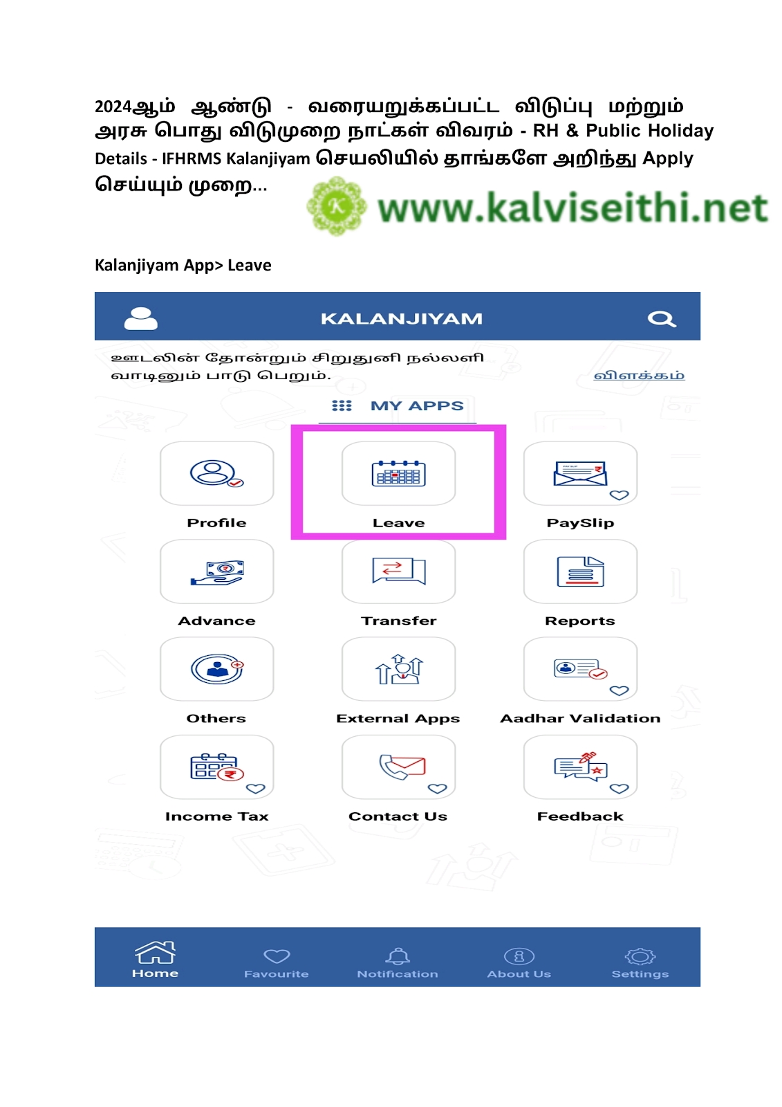 2024ஆம் ஆண்டு - வரையறுக்கப்பட்ட விடுப்பு மற்றும் அரசு பொது விடுமுறை நாட்கள் விவரம் - IFHRMS Kalanjiyam செயலியில் தாங்களே அறிந்து Apply செய்யும் முறை.
